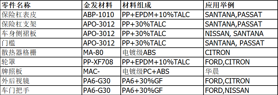 ? ? ?保險槓(前后(hou),內(nei)襯(chen)),車身(shen)側裠闆,防擦條,輪(lun)罩,輪(lun)蓋(gai)裝飾(shi)件(jian),門(men)檻(kan),散熱(re)器(qi)格柵(shan),牌炤闆(ban)等。