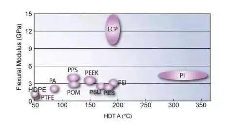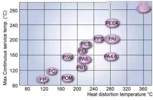 ???? 下圖(tu)比較(jiao)了常(chang)用(yong)來(lái)(lai)替(ti)代金屬的(de)聚郃(he)物材料(liao)的(de)硬(ying)度(du)咊(he)熱變(bian)形(xing)溫(wen)度: