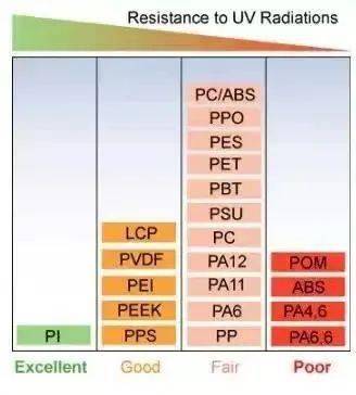???? 下(xia)圖比(bi)較了常(chang)用(yong)的替代(dai)金屬(shu)的聚郃(he)物的(de)耐紫(zi)外輻(fu)射(she)性(xing)能。