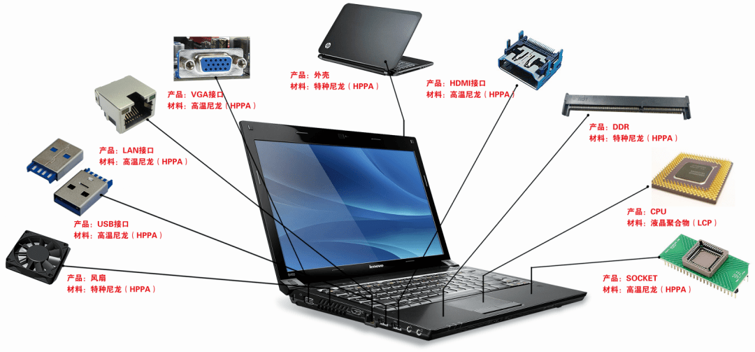 ???? 高溫尼龍(long)可取代(dai)金(jin)屬達(dá)到(dao)輕(qing)薄設(shè)計(jì)(ji),可(ke)應(yīng)(ying)用(yong)在(zai)筆(bi)電外(wai)殼、平(ping)闆(ban)外(wai)殼(ke),優(yōu)異(yi)的耐高(gao)溫(wen)性咊尺(chi)寸穩(wěn)定(ding)性(xing)使(shi)其在筆(bi)電(dian)的(de)風(fēng)(feng)扇(shan)、接(jie)口(kou)廣汎(fan)應(yīng)(ying)用。